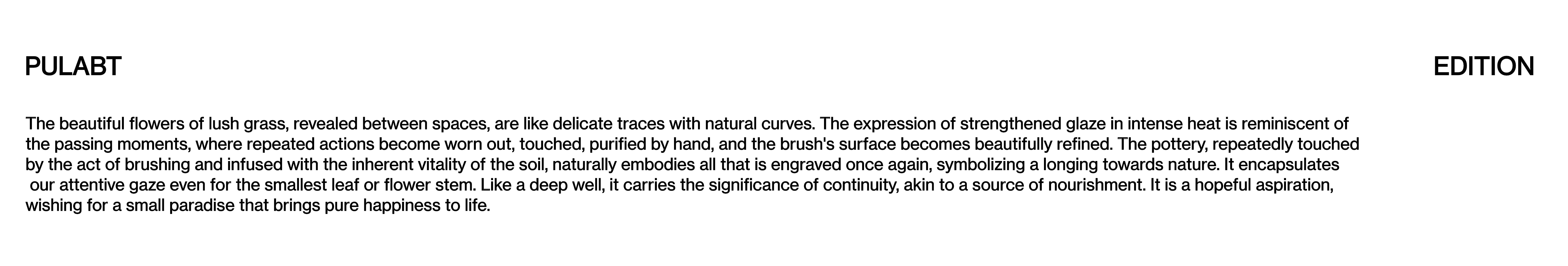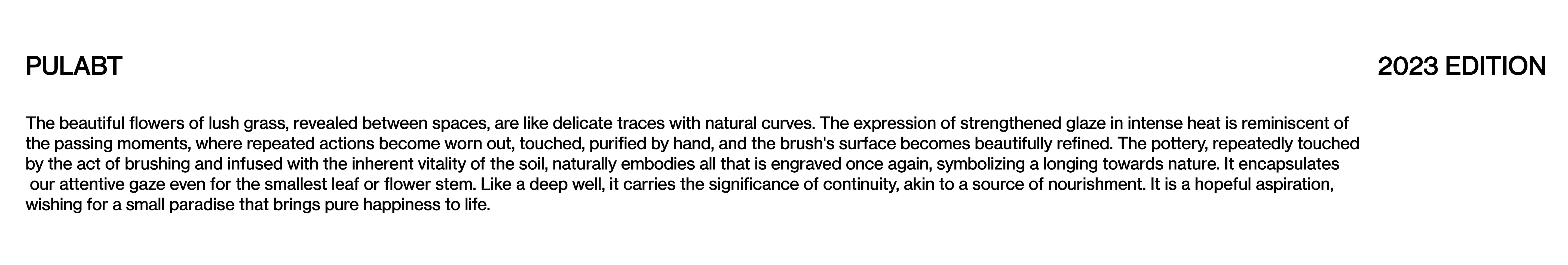 The beautiful flowers of lush grass, revealed between spaces, are like delicate traces with natural curves. The expression of strengthened glaze in intense heat is reminiscent of the passing moments, where repeated actions become worn out, touched, purified by hand, and the brush's surface becomes beautifully refined. The pottery, repeatedly touched by the act of brushing and infused with the inherent vitality of the soil, naturally embodies all that is engraved once again, symbolizing a longing towards nature. It encapsulates our attentive gaze even for the smallest leaf or flower stem. Like a deep well, it carries the significance of continuity, akin to a source of nourishment. It is a hopeful aspiration, wishing for a small paradise that brings pure happiness to life.